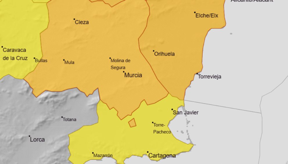 La Agencia Estatal de Meteorología (Aemet) emite un aviso amarillo por lluvia y tormentas para Cartagena y gran parte de la Región este martes, 9 de septiembre. También están en aviso amarillo y naranja algunas zonas de las provincias limítrofes de Alicante y Almería.