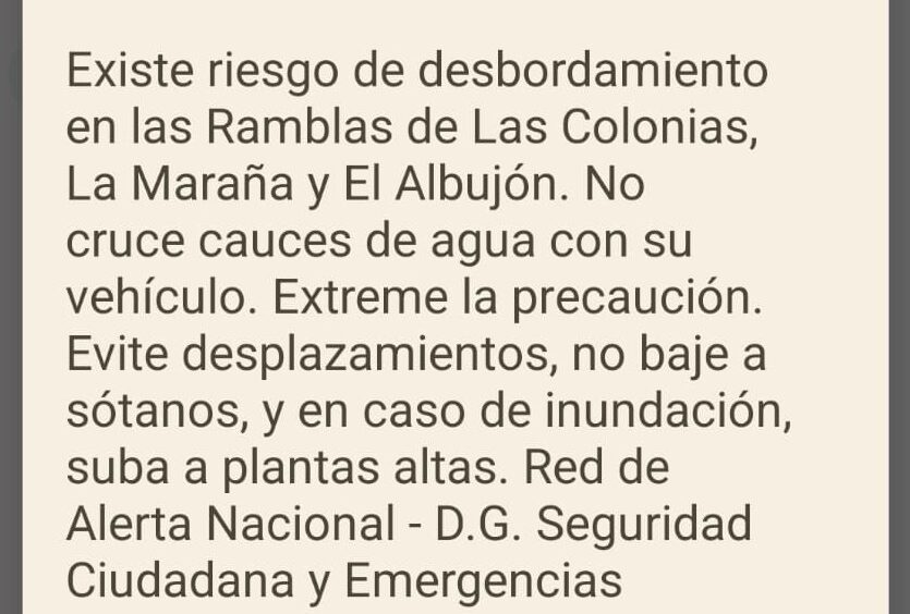 La Dirección General de Seguridad Ciudadana y Emergencias ha emitido una alerta de Protección Civil a través de los móviles mediante el sistema Es-Alert por riesgo de desbordamiento en las Ramblas de Las Colonias, La Maraña y El Albujón, para Los Alcazares.