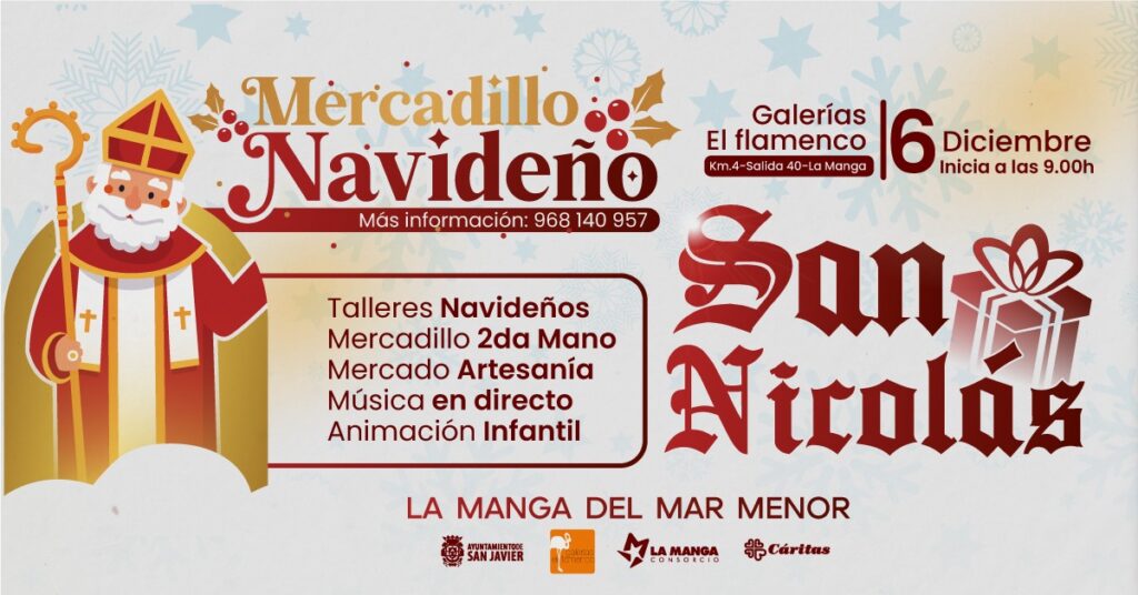 La Manga del Mar Menor se prepara para vivir uno de los eventos más esperados del inicio de la temporada navideña. El próximo sábado 6 de diciembre, el Centro Comercial Galerías El Flamenco (Km 4, La Manga del Mar Menor) acogerá una nueva edición del Mercadillo Navideño de San Nicolás, una jornada solidaria y festiva que reunirá a vecinos, visitantes y decenas de expositores desde las 9:00 horas.
