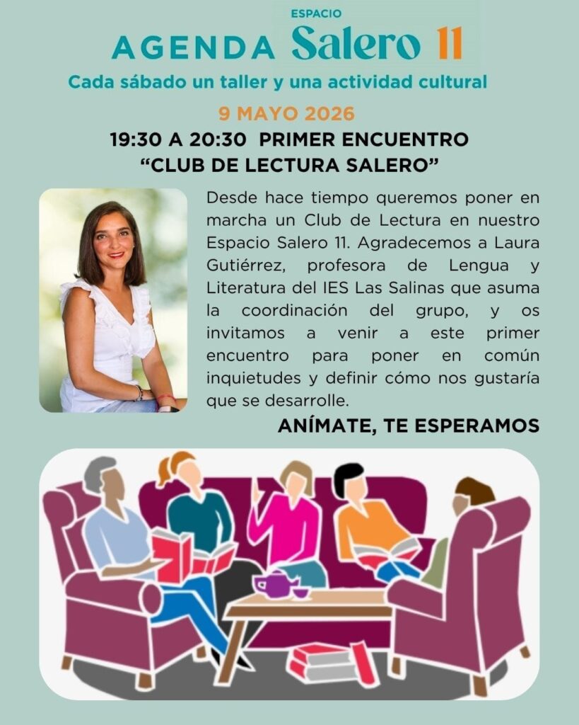 La programación continuará el 9 de mayo con una de las grandes novedades del espacio: el estreno del “Club de Lectura Salero”, una iniciativa pensada para los amantes de la lectura. El encuentro estará dirigido por Laura Gutiérrez, profesora del IES Las Salinas.