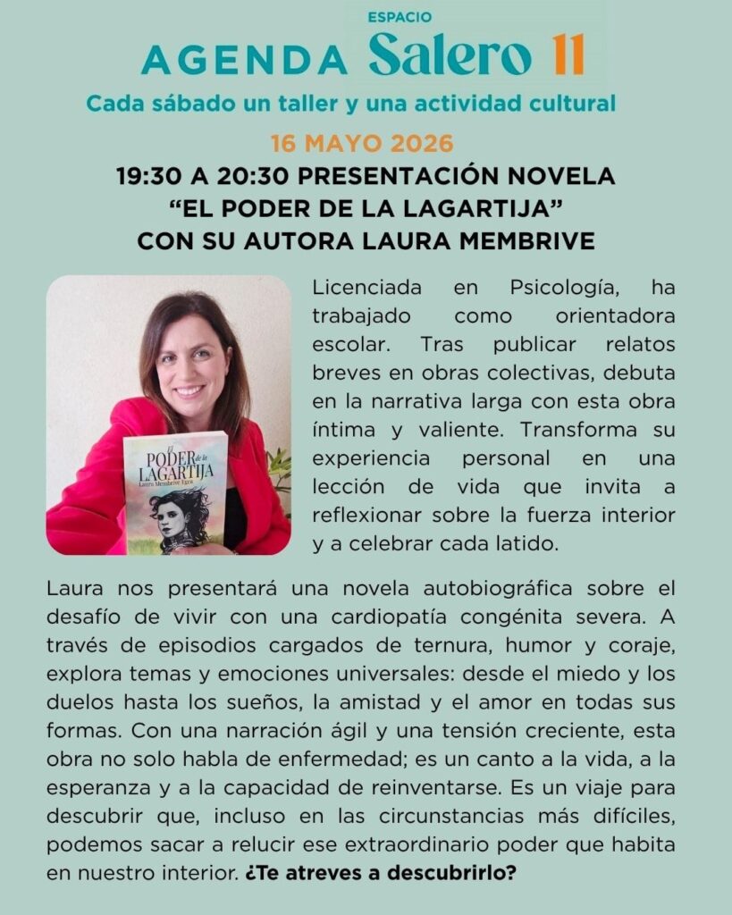 El sábado 16 de mayo será el turno de la literatura con la presentación de la novela El poder de la lagartija, de la escritora Laura Membrive, una obra que promete emocionar por su carga vital y su carácter inspirador.