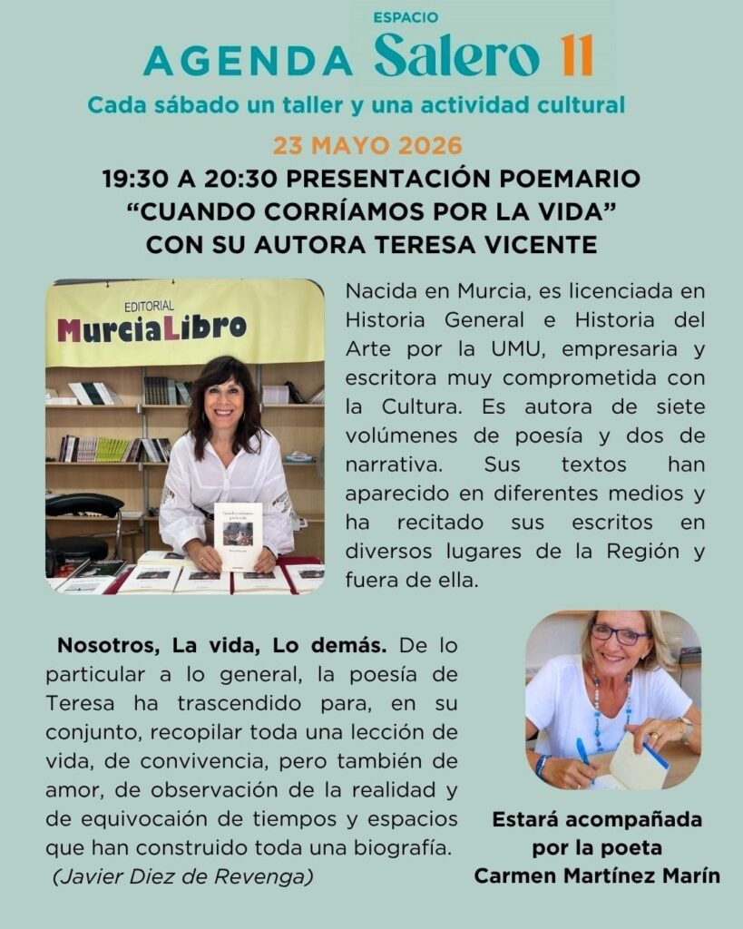 La poesía tomará el relevo el 23 de mayo con la participación de la autora murciana Teresa Vicente, que estará acompañada por Carmen Martínez Marín en una velada dedicada a la palabra y la sensibilidad artística.