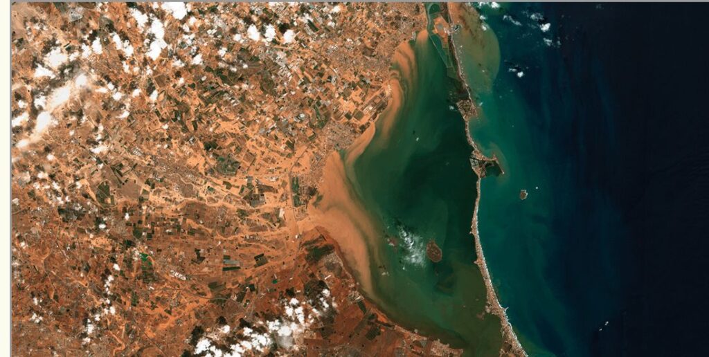 Las fotografías satelitales permiten identificar las zonas donde se concentran los aportes de agua y sedimentos, ofreciendo una perspectiva global sobre el estado actual del Mar Menor tras las últimas lluvias.
