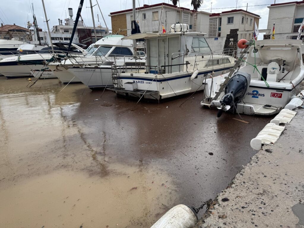 En el puerto de Cabo de Palos, los arrastres de agua han llevado gran cantidad de basura y restos directamente al mar, acumulándose junto a los barcos y en la zona de la iglesia.