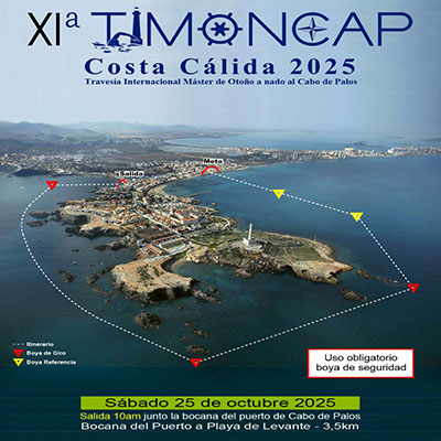 El sábado 25 de octubre de 2025 tendrá lugar la undécima edición de la TIMONCAP COSTA CÁLIDA, una de las travesías a nado más destacadas de la Región de Murcia, organizada por el Club Natación Máster Murcia.